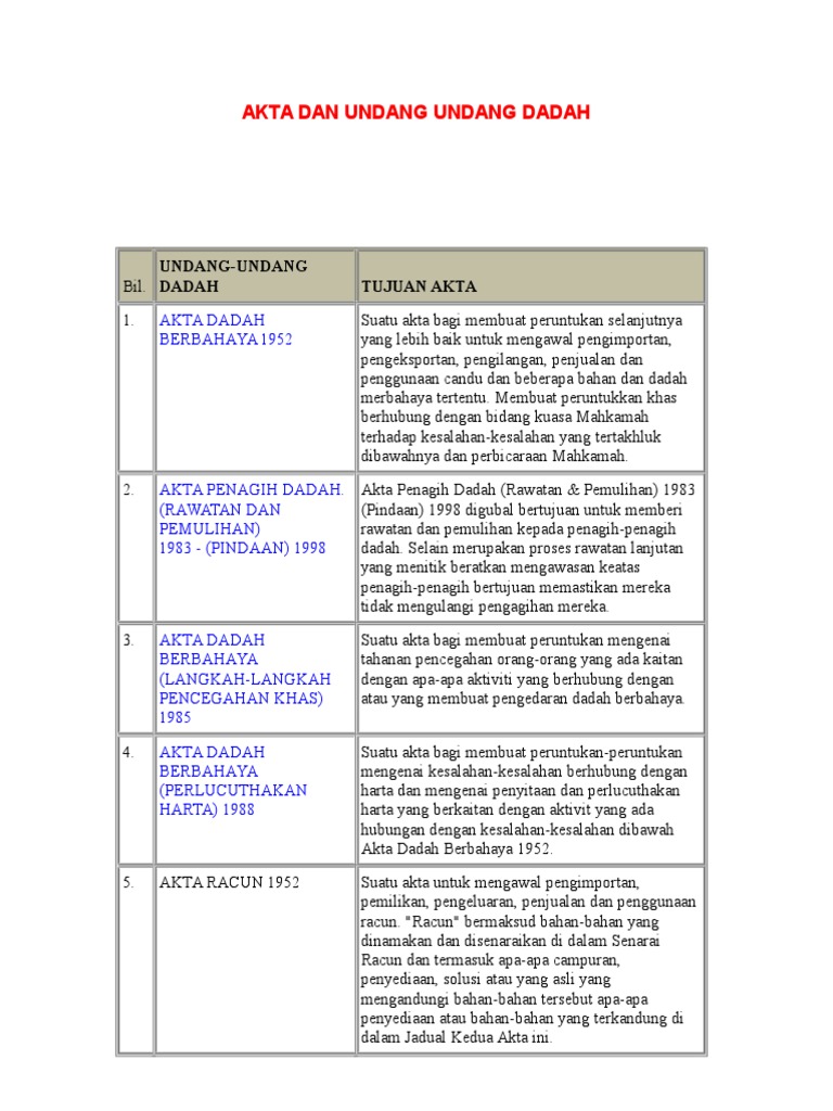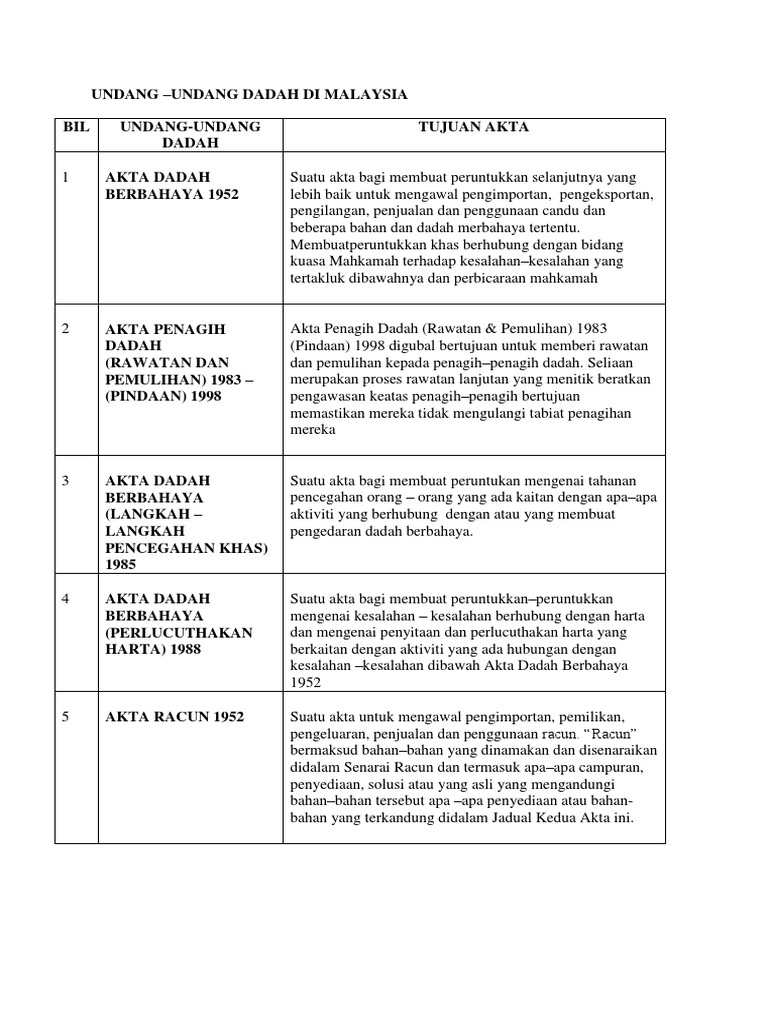 Akta dadah berbahaya 1952 bertujuan membuat peruntukan selanjutnya yang lebih baik untuk mengawal pengimportan pengeksportan pengilangan penjualan dan penggunaan candu dan beberapa bahan dan dadah merbahaya tertentu. Oct 19 2010 akta dadah berbahaya 1952.