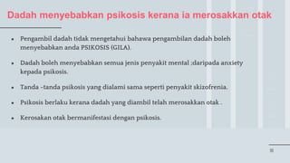 Semua tanda ini mungkin menunjukkan kehadiran pengeluaran dadah. Hadapi tekanan rakan sebaya dengan berkesan. Kesan dadah ke atas seseorang bergantung kepada pelbagai faktor antaranya saiz tubuh badan kesihatan individu dan sama ada terdapat dadah lain di dalam tubuh badan seseorang pada masa yang sama semasa pengambilan dadah.