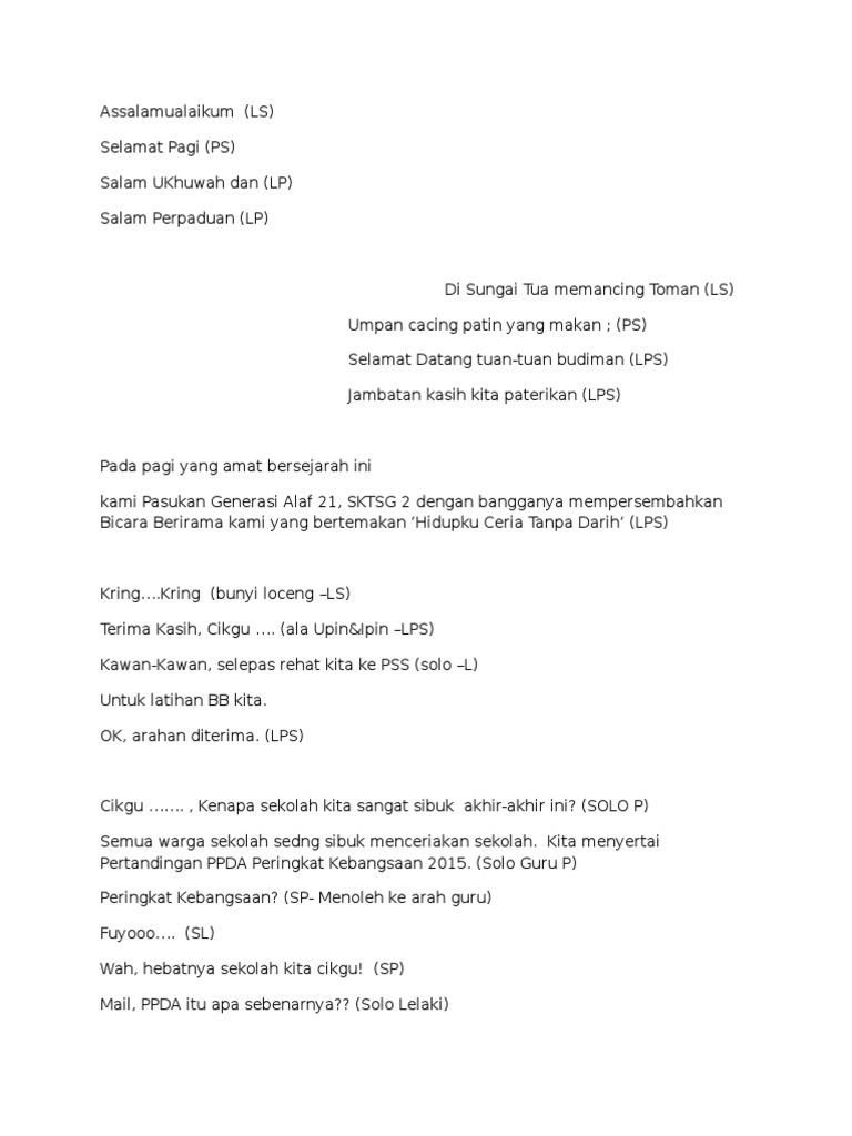 Nak karang skrip ni susah jugaklah bagi aku sebab unsur kecindan lucu itu yang susah nak letak. Pertandingan Bicara Berirama Peringkat SPS 2017 Tarikh. Bagi murid Tahap 2.