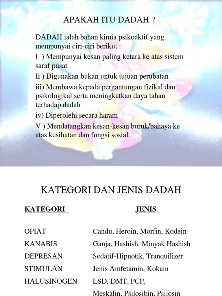 - Makanan pakaian dan minuman manusia mestilah dari sumber yang baik lagi halal. Koordinasi Badan Jenis dadah dan ciri-cirinya Jenis Dadah Contoh Ciri-ciri Depresen Morfin Mengurangkan tekanan Heroin Menenteramkan fikiran Barbiturat seseorang Melambatkan tindak balas terhadap rangsangan Stimulan Amfetamin Meningkatkan kadar Nikotina metabolisma badan Menjadikan seseorang lebih aktif Opiat. Penggunaan dadah lebih kerap berlaku pada orang dewa a yang berumur 35 tahun ke ata dan di luar u ia terdapat Kandungan.