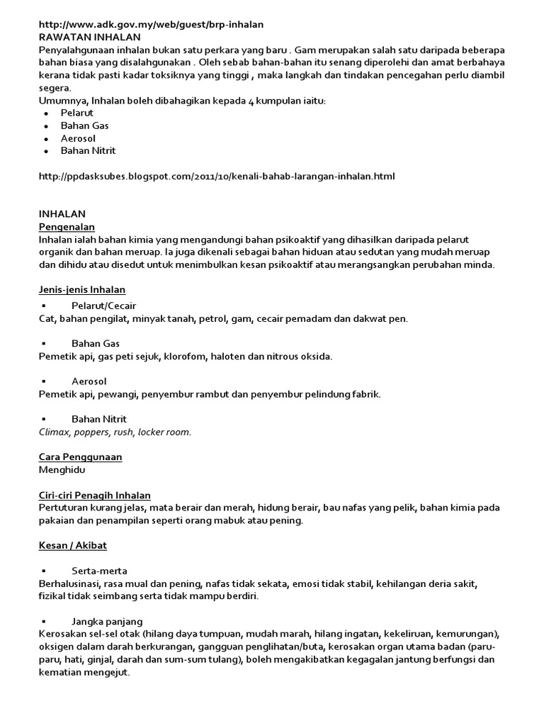 Susut berat badan pendarahan dalam otak hapetitis B sistem saraf tunjang rosak ganguan paru-paru dan saluran penafasan mati. Inhalan juga dikenali sebagai bahan hiduan atau sedutan yang mudah meruap Volatile. Walau bagaimana pun banyak persamaan dengan dadah dari segi kesannya.