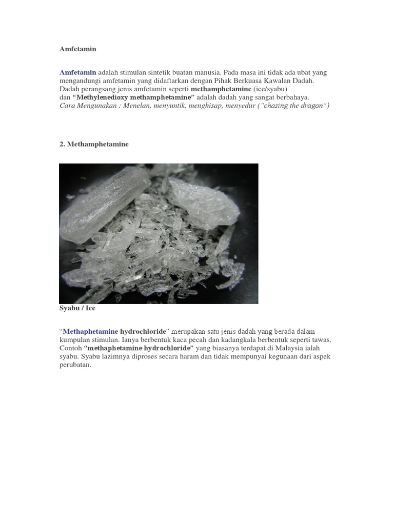 Di Malaysia ia mula digunakan secara berleluasa kira-kira dua tiga tahun yang lalu berikutan kesukaran mendapatkan bekalan heroin. Opiat Heroin morfin candu dan kodein. ATS merujuk kepada sekumpulan dadah termasuk amphetamine methamphetamine 34-methylenedioxyamphetamine MDA dan 34-Methylenedioxy methamphetamine MDMA.