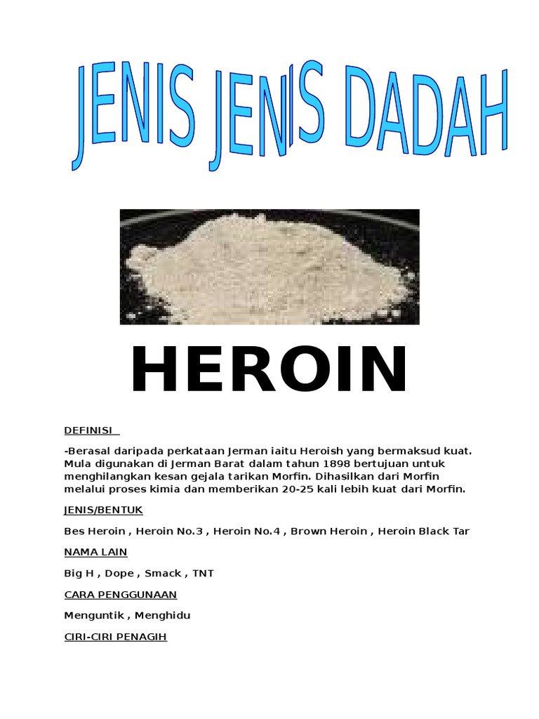 Heroin yang dibeli di pasaran aelap adalah berwarna putih tepung keputih-putihan kualiti. Kesemua yang ditahan disiasat mengikut Seksyen 3 1 Akta Penagihan Dadah 1983. Iii Kesan Pengambilan Dadah Depresen Penagih depresen akan berasa khayal peluh berlebihan terhoyong-hayang dan juga pengecilan anak mata.