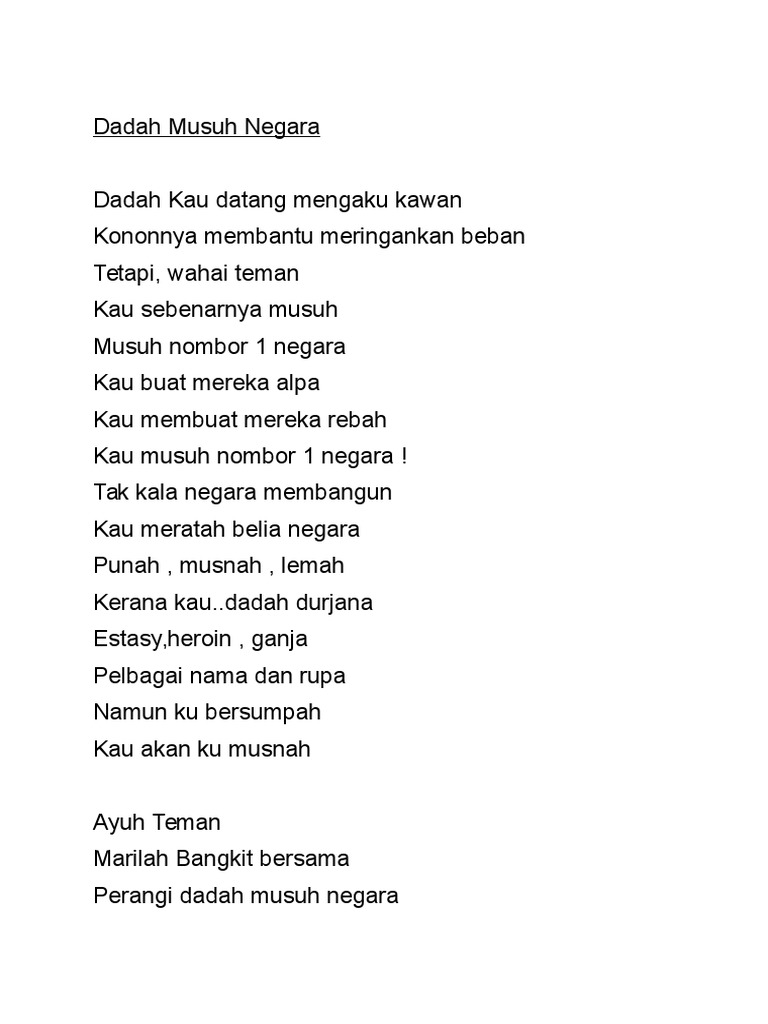 Dadah merupakan musuh nombor satu negara A A A BERTINDAK luar kawal sehingga membawa kepada jenayah membunuh. Oleh itu amatlah perlu bagi semua individu keluarga dan pihak. Masing-masing memainkan peranan memerangi dadah sehinggakan kalau kita masih ingat antara ayat yang sering digunakan ialah dadah musuh nombor satu negara jelas beliau.