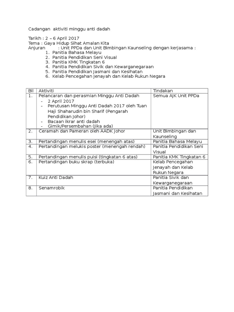 Cadangan Aktiviti Minggu Anti Dadah Pdf